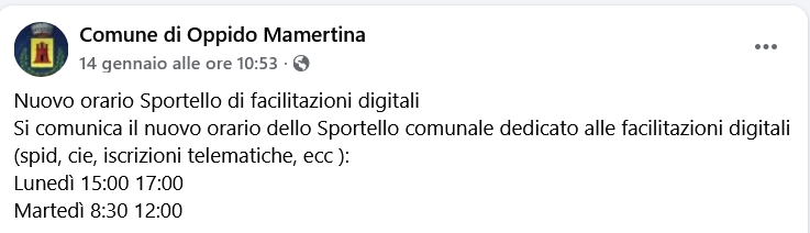 14 gennaio 2026 - Nuovo orario Sportello di facilitazioni digitali