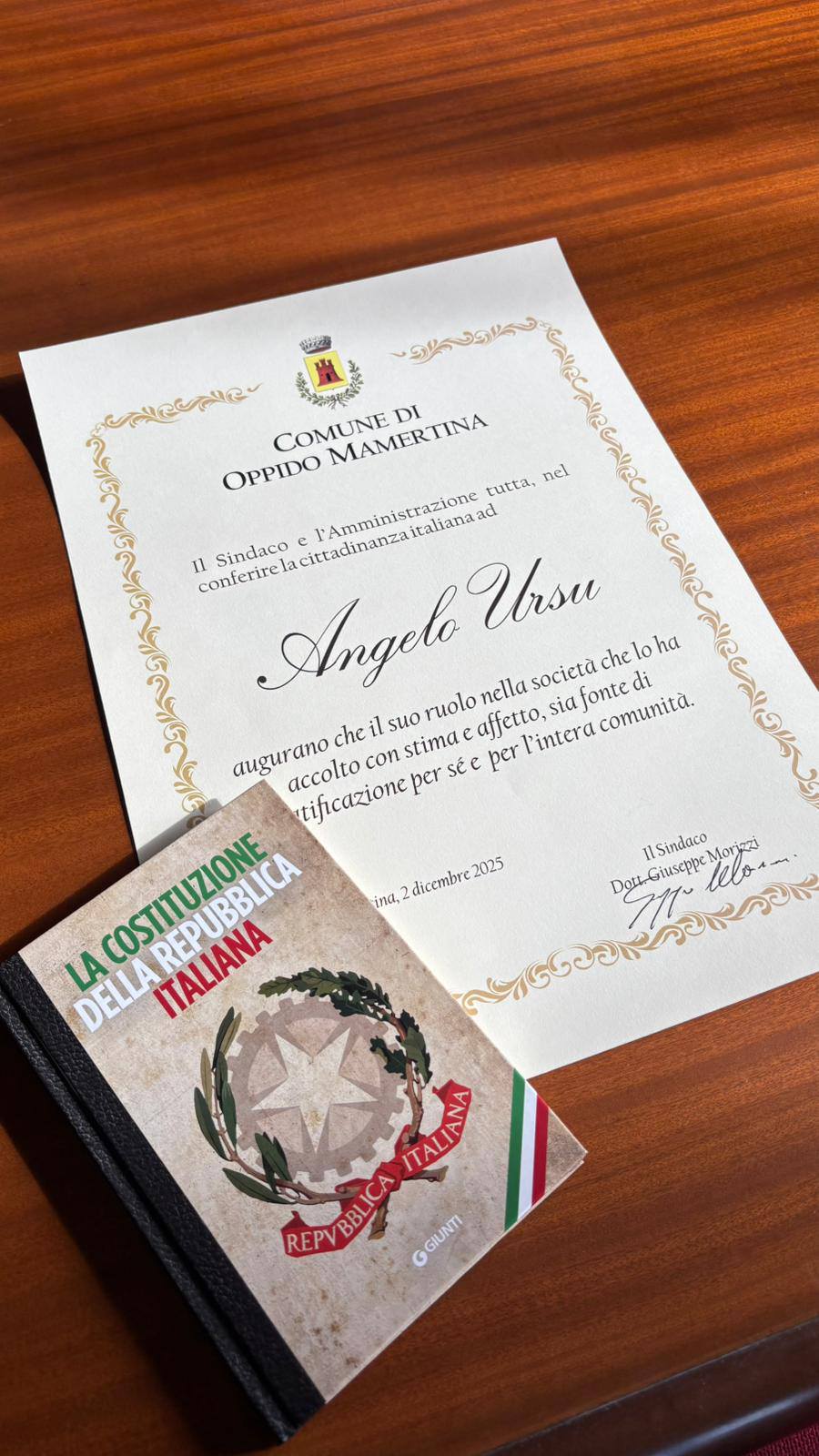2 dicembre 2025 – Cerimonia di consegna della copia della Costituzione e di una pergamena a ricordo al concittadino Angelo Ursu per l’acquisizione della cittadinanza italiana.