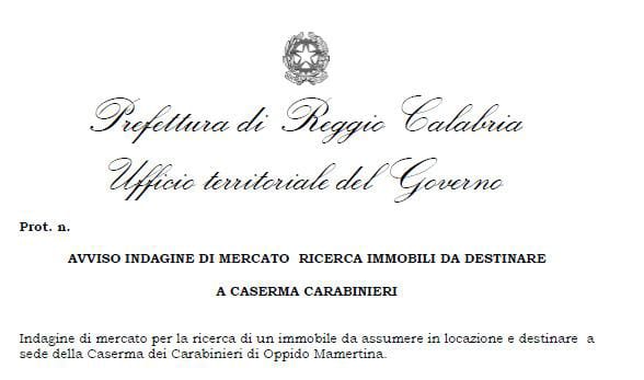 29 ottobre 2025 - Avviso indagine di mercato per la ricerca di un immobile da assumere in locazione e destinare a sede della Caserma Carabinieri di Oppido Mamertina