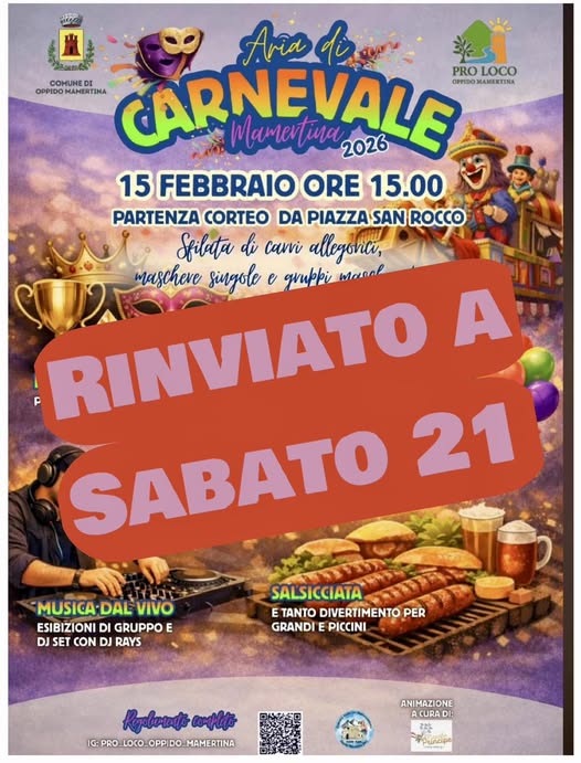 A causa delle avverse condizioni meteo, la grande festa per il carnevale oppidese, prevista per giorno 15 febbraio, è stata rinviata a sabato prossimo, 21 febbraio, con gli stessi orari e le stesse attrazioni inizialmente previste.