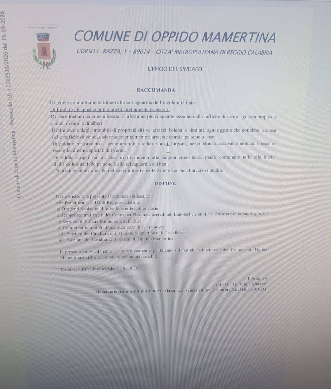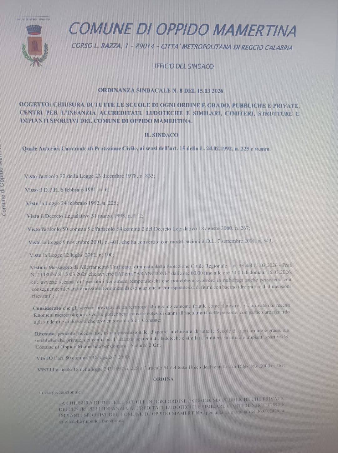 Pubblicata l'ordinanza sindacale di chiusura delle Scuole di ogni ordine e grado per la giornata di lunedi 16 marzo 2026.