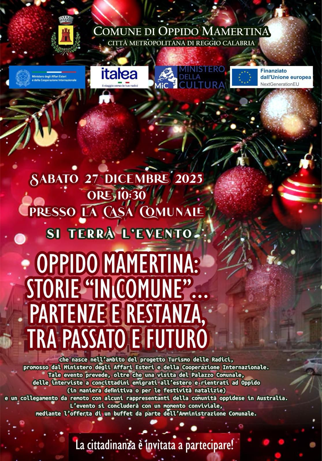 Siamo felici di presentare il progetto "Oppido Mamertina: storie 'in Comune'... Partenze e Restanza tra passato e futuro", nato grazie all'iniziativa del Ministero degli Affari Esteri che, in occasione del Progetto Turismo delle Radici, finanziato al Comune nel corso dell'anno 2024 per la realizzazione di eventi di valorizzazione del tema dell'emigrazione di ritorno e del territorio, ha voluto concedere un ulteriore piccolo contributo al nostro ente, premiandolo per aver saputo utilizzare al meglio le risorse del 2024, e destinando tale contributo alla realizzazione di un evento tematico da svolgersi entro il 6 gennaio 2026.