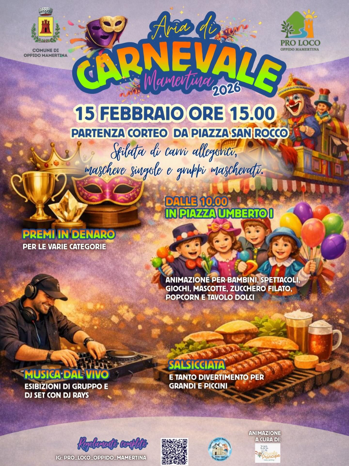 Quest'anno l'Amministrazione Comunale ha incaricato la Pro Loco Oppido Mamertina di realizzare la seconda edizione di Aria di Carnevale Mamertina 2026, con fondi a totale carico del bilancio comunale.