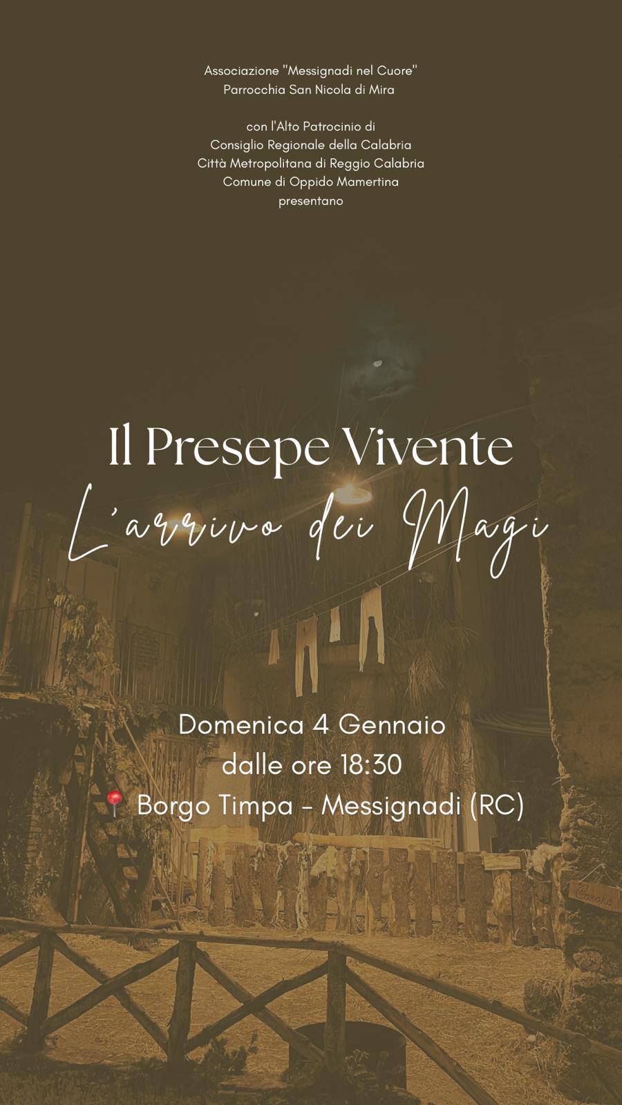 Il 4 gennaio, alle ore 18.30 patrocinato dal Comune, a Messignadi presso Borgo Timpa, si è tenuto l'evento "L'arrivo dei Magi al Presepe Vivente", organizzato dall'Associazione Messignadi nel cuore.